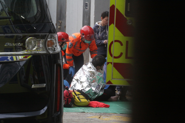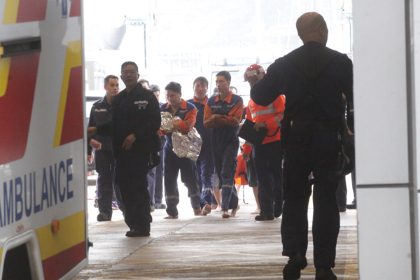 南丫島以南海面發生運油輪大火,多名堕海船員獲救後被送到岸上作初步治理,然後再由救護車送往各間醫院治療。(記者區天海攝)