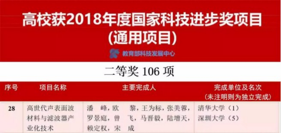 深圳大学罗景庭副教授参与完成的“高世代声表面波材料与滤波器产业化技术”荣获2018年度国家科技进步二等奖
