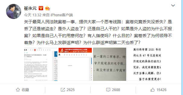 最高法回应崔永元千亿矿权案卷丢失质疑:启动调查