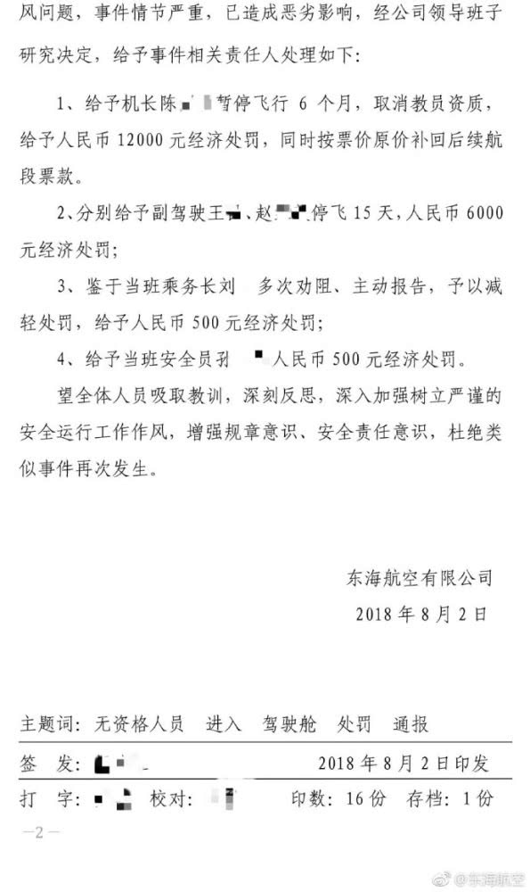 最新消息:近日,就网上传播关于东海航空飞行员陈某某于2018年7月28日执行DZ6286、DZ6206次航班时擅自允许其夫人进入驾驶舱的事件,东海航空已于2018年8月2日对该航班机组人员进行严肃处理并给予内部通报。