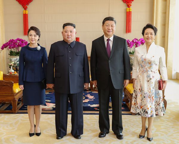 会见后,习近平总书记夫妇为金正恩委员长夫妇举行午宴。