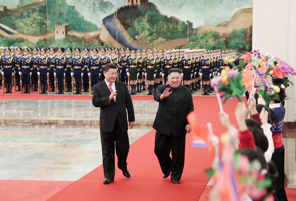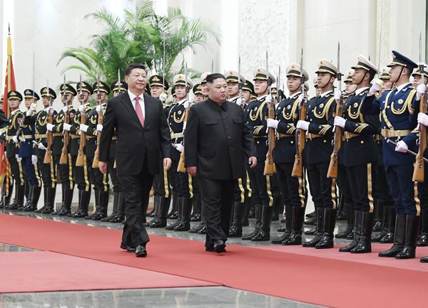 1月8日,中共中央总书记、国家主席习近平同当日抵京的朝鲜劳动党委员长、国务委员会委员长金正恩举行会谈。会谈前,习近平在人民大会堂北大厅为金正恩举行欢迎仪式。 新华社