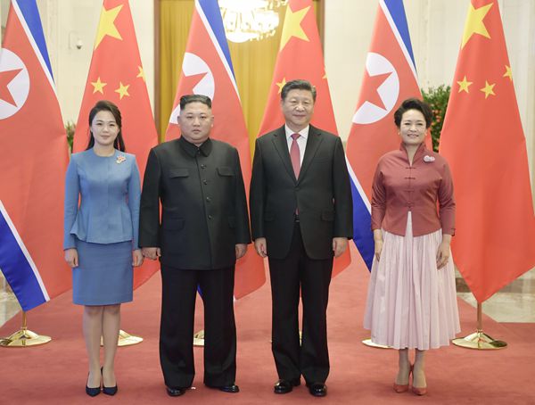 1月8日,中共中央总书记、国家主席习近平同当日抵京的朝鲜劳动党委员长、国务委员会委员长金正恩举行会谈。会谈前,习近平在人民大会堂北大厅为金正恩举行欢迎仪式。这是习近平和夫人彭丽媛同金正恩和夫人李雪主合影。 新华社