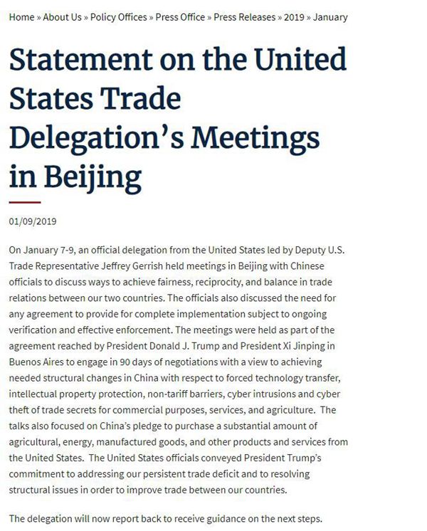 據路透社報道,一名美國官員表示,來到北京的美國貿易代表團結束與中國官員的會議,在歷經「不錯的幾天後」將於周三稍晚返美。