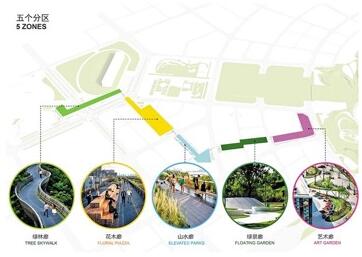 根据设计方案,滨海廊桥共分为绿林廊、花木廊、山水廊、绿景廊和艺术廊五大分区。不同的特色主题不仅有助于提升滨海廊桥的穿行体验,同时也将区域化提升城市街块的公共空间品质。
