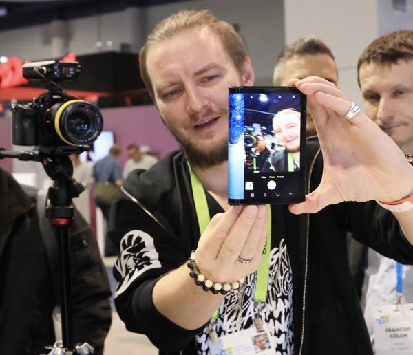 观众体验全球首款可折叠柔性屏手机FlexPai柔派