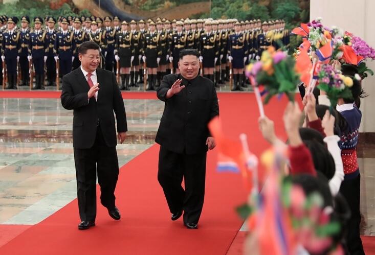 1月8日,中共中央总书记、国家主席习近平同当日抵京的朝鲜劳动党委员长、国务委员会委员长金正恩举行会谈。会谈前,习近平在人民大会堂北大厅为金正恩举行欢迎仪式。 新华社