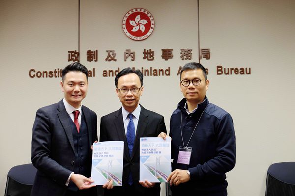 民建聯立法會議員周浩鼎(左)及陳恒鑌(右),昨日向政制及內地事務局局長聶德權(中)提交大灣區交通建議書。