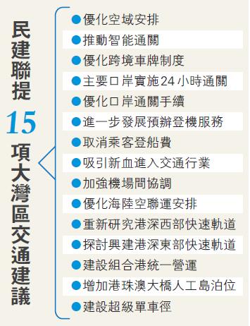 海路方面,建議取消乘客登船費。現時香港海事處按法例向境外線渡輪擁有人徵收每人11元的乘客登船費,建議書促請香港政府應盡快取消此項收費,以促進大灣區航運發展。另外,也建議建設組合港統一營運。建議書提到,粵港澳三地政府考慮統籌港口規劃,促進區域內各港口合理分工,更可研究在珠江口建設聯合港口,成立聯合機構,進行統一管理。