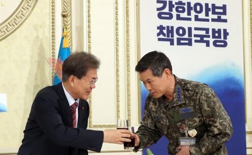 文在寅与韩国防长郑景斗(韩联社)