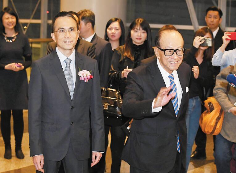 已经退休的李嘉诚(右)表示,坚持天天返公司工作,最近主要忙基金会的事情,左为长实主席李泽钜。记者 崔俊良 摄
