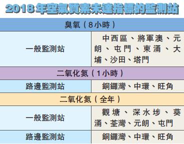 全港有13個一般監測站中,當中有6個監測站,包括觀塘、深水?、葵涌、荃灣、元朗及屯門的二氧化氮含量,不達全年空氣質素指標;3個路邊監測站包括銅鑼灣、中環及旺角的二氧化氮含量全部均未達全年空氣質素指標。