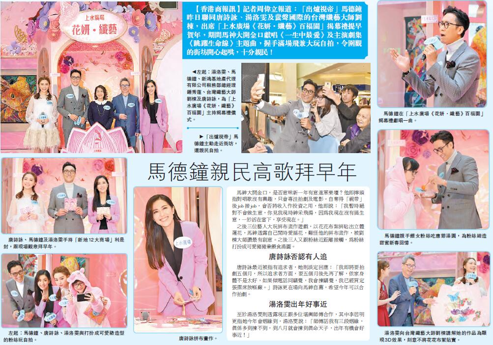 【香港商報网訊】記者周偉立報道:「出爐視帝」馬德鐘昨日聯同唐詩詠、湯洛雯及蜚聲國際的台灣纖藝大師劉棟,出席「上水廣場《花妍?纖藝》百福園」揭幕禮提早賀年,期間馬神大開金口獻唱《一生中最愛》及主演劇集《跳躍生命線》主題曲,握手滿場飛兼大玩自拍,令圍觀的街坊開心起哄,十分親民!