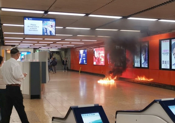 港鐵旺角站大堂有物件起火,火光熊熊,警方事後列為縱火案。 網上圖片