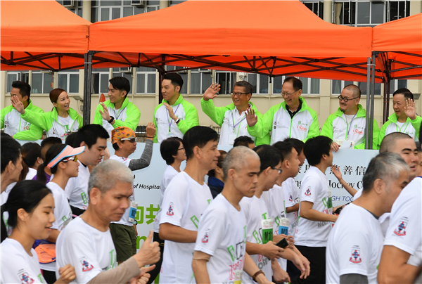 陈茂波(后排右四)与东华三院主席王贤志(后排左四)等人主持起跑礼。