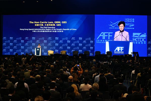 昨日,第12屆亞洲金融論壇在香港會展中心開幕,行政長官林鄭月娥出席開幕式,期間與嘉賓相談甚歡。 記者蔡啟文攝