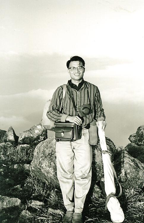 朱維德留影於鳳凰山頂,背囊、相機盒、相機、雜物袋、手攜軍用床,全部逾50磅。