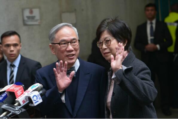 至早上9时许,曾荫权终于脱离轮椅及囚衣,身穿西装及打上领结,在太太曾鲍笑薇的陪伴下回答传媒提问。