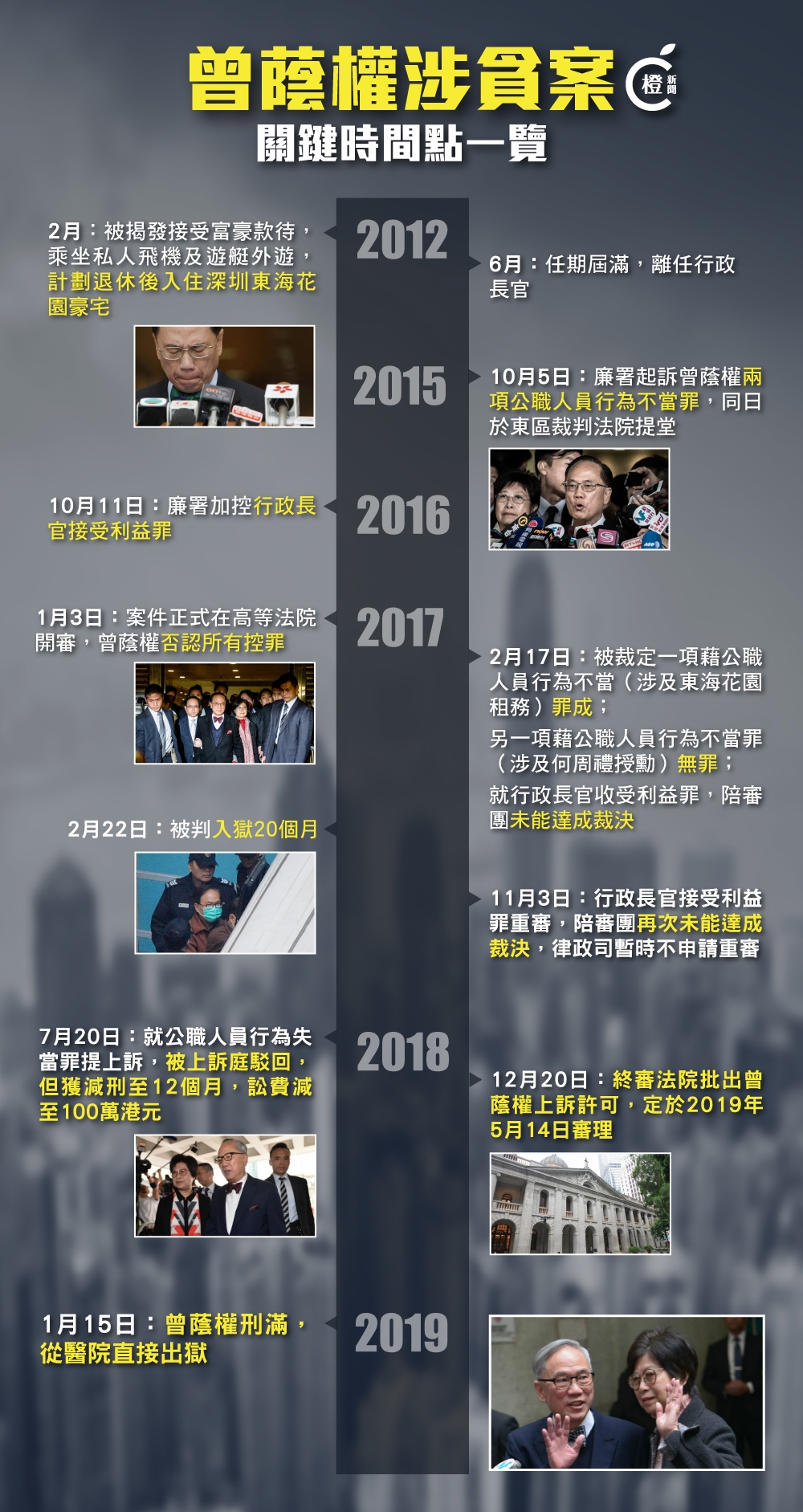 曾蔭權於2017年2月被裁定一項公職人員行為失當罪成,判監20個月,他提出上訴,法庭維持定罪原判,但減刑至12個月。曾蔭權在去年12月已向終審法院提出終審上訴,排期5月14日開審。