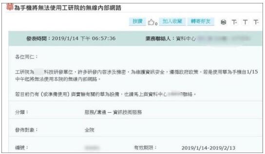 据台湾《中国时报》1月14日消息,台湾“工研院”14日发出内部通告,自15日中午起,在“工研院”办公场所将限制使用华为手机、电脑等,若是使用华为手机将无法使用工研院的无线内部网络,以避免泄密。值得注意的是,台湾通讯传播委员会昨天(13日)再补一枪,台湾通讯传播委员会副主席兼发言人翁柏宗14日进一步表示,未来5G也会比照办理。