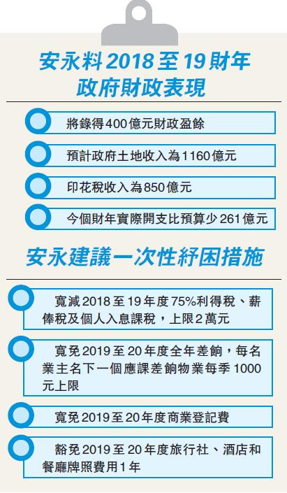 安永建議推出多項一次性紓困措施,包括寬減2018至19年度75%的利得稅、薪俸稅及個人入息課稅,上限為2萬元;寬免2019至20年度全年差餉,每名業主名下一個應課差餉物業每季1000元為上限;寬免2019至20年度商業登記費;豁免旅行社、酒店和餐廳牌照費用一年。該行預計,以上建議的一次性紓困措施將會令政府收入減少300億元。