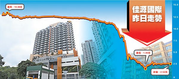 佳源國際昨日午後遭「清倉式」拋售,最多曾暴瀉逾89%,股價曾低見1.4元,最終收報2.52元,急插逾80%,成交額高達11億元,全日市值蒸發逾260億元。而該公司本金額4億美元票息12%,2020年到期的債券亦曾急挫30%創下新低。同時,事件觸發市場對內房債危機的憂慮,牽連多隻細價股,包括小型內房股陽光100(2608),以及非內房股如宏達金融(1822)及仁天科技(885)等亦慘當「炮灰」,以上3隻股票昨日均曾最多跌近80%,收市跌幅則介乎65%至73%。