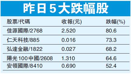 昨天斬倉的嫌疑證券行之一是建銀國際,該行除持倉佳源國際外,另有1615.3萬股陽光100(2608)、28萬股弘達金融(1822)及4591.731萬股仁天科技(885),初步吻合條件。