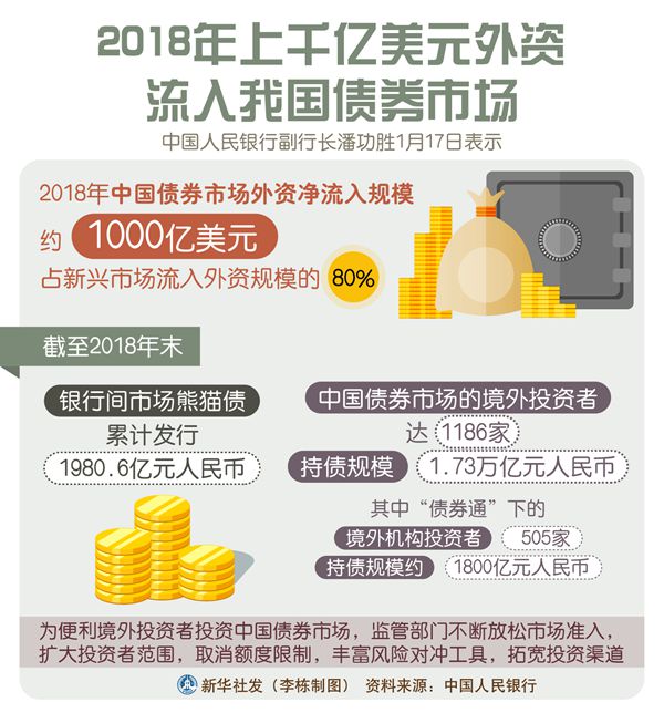 數據顯示,截至2018年末,銀行間市場熊貓債累計發行1980.6億元人民幣;中國債券市場的境外投資者達1186家,持債規模1.73萬億元人民幣,其中「債券通」下的境外機構投資者505家,持債規模約1800億元人民幣。