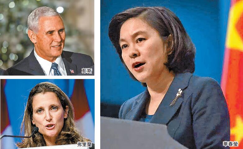【香港商報网訊】針對之前美國副總統彭斯在美駐外使節會上對中國發表不實指責和加拿大外長弗里蘭稱不會再對中國無視法律和規則的行為視而不見的說法,中國外交部發言人華春瑩17日在例行記者會上告誡兩國勿口不擇言,搞「國家誹謗」。她批評美方對國際規則「合則用、不合則棄」、加方則不顧信譽和形象喪失了是非標準。