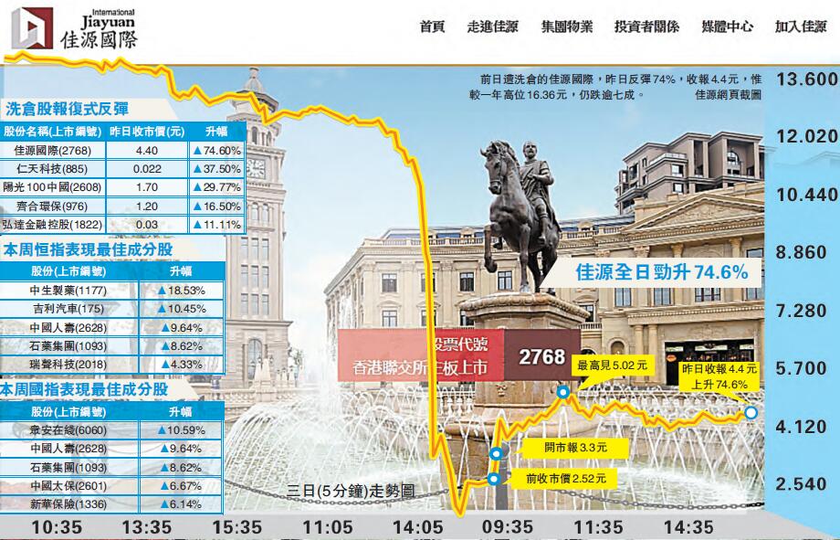 由於關注佳源一筆3.5億美元票據到期,其股價於周四出現洗倉式暴跌,一度瀉近九成,最低見1.4元,公司隨後發公告,確認3.5億美元、票息8.125厘的優先票據,已償還全數款項,公司股價於周五反彈74%,成交額增至18億元,較前日增加逾六成。