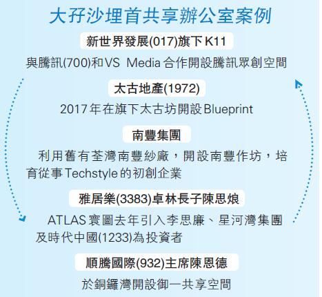 太古地產(1972)、新世界發展(017)旗下K11、南豐集團捷足先登,開拓共享辦公室領域的藍海。其中,太古地產於旗下鰂魚涌太古坊開設的Blueprint於2017年開幕,佔地約3萬平方呎,其開放式工作空間可容納95人及14個私人辦公室。