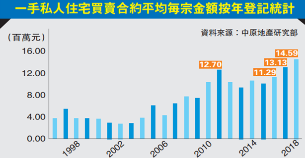 【香港商報网訊】中原地產研究部高級聯席董事黃良昇指出,2018年登記一手私人住宅買賣合約,平均每宗1459萬元,數字連續三年上升,兼連續兩年創歷史新高。2017年是1313萬元,2016年是1129萬元。再對上一次新高是2011年,每宗1270萬元。數字連續創新高,因為樓價屢創新高,兼且有較多豪宅推售。