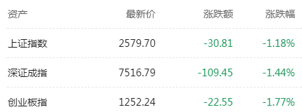 【香港商报网讯】A股三大股指今日全线走弱,沪指收盘下跌1.18%,收报2579.70点;深成指下跌1.44%,收报7516.79点;创业板指下跌1.77%,收报1252.24点。市场成交量继续萎缩,两市合计成交仅有2786亿,行业板块呈现普跌态势。
