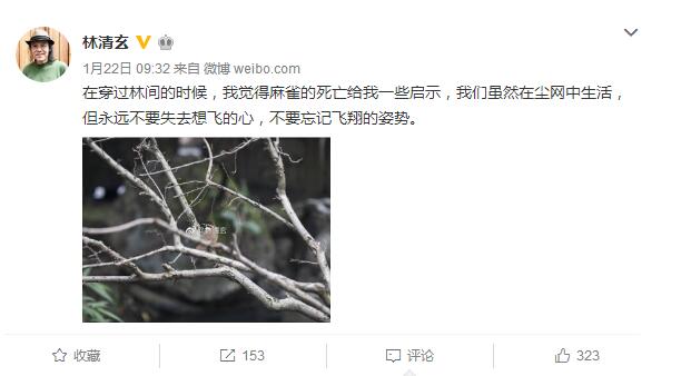 据台湾《自由时报》报道,台湾知名作家林清玄过世,终年65岁。昨天,林清玄还曾发微博称:“在穿过林间的时候,我觉得麻雀的死亡给我一些启示,我们虽然在尘网中生活,但永远不要失去想飞的心,不要忘记飞翔的姿势。”