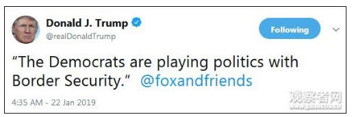 凌晨4点半时,特朗普引用福克斯新闻节目的话:“民主党人在边境安全问题上玩政治。”