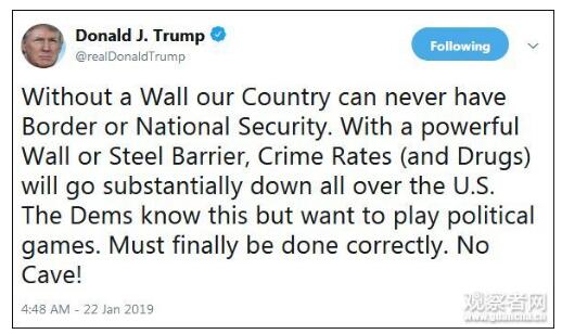 “没有墙,我们的国家就不会有边境或国家安全。有了强有力的墙或钢铁屏障,美国各地的犯罪率(和毒品)将大幅下降。民主党人知道这一点,但他们想玩政治游戏。但最后,必须正确行事。没得商量!”