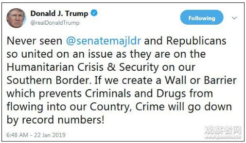 夸一夸共和党人:“从来没有见过麦康奈尔和共和党人在一个问题上,像他们在我们南部边境的人道主义危机和安全问题上那样团结。如果我们筑起一道墙或一道屏障,阻止犯罪分子和毒品流入我们的国家,那么犯罪率将会创纪录地下降!”