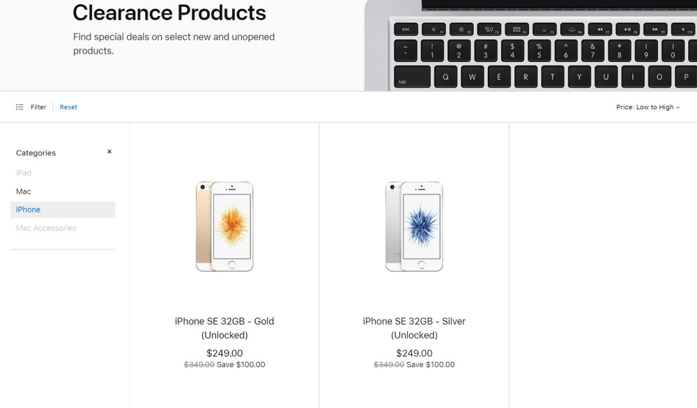 目前,苹果北美官网清仓页面中显示的情况是,iPhone SE 32GB售价249美元,约合人民币1687元,其比之前的原价便宜了100美元。