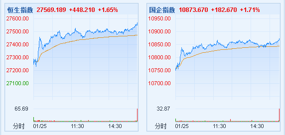 【香港商报网讯】今日开盘,港股恒生指数高开0.6%,之后持续走高,截止收盘,恒生指数涨1.65%,报27569.19点;国企指数涨1.71%,报10873.67点;红筹指数涨0.54%,报4358.46点。大市成交1064.02亿港元。个股方面,受利好消息影响,腾讯控股涨4.12%,报343.8元。