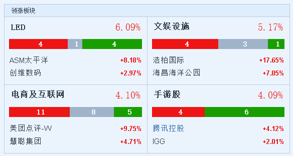 板块方面,LED、文娱设施、半导体、电商及互联网、手游股领涨。