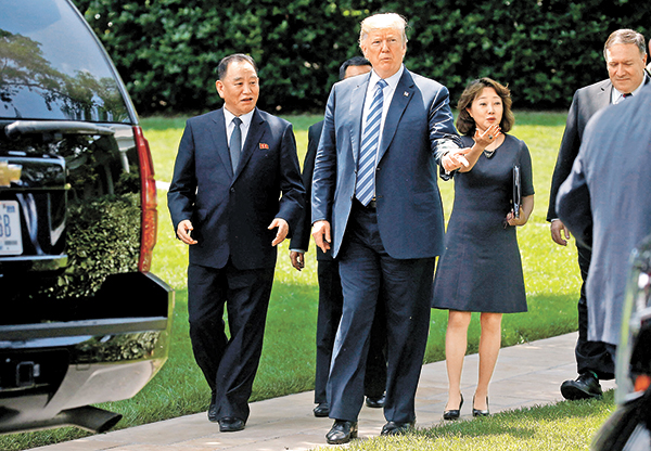 美國國務卿蓬佩奧24日表示,第二次特金會將在60天內舉行。圖為朝鮮勞動黨中央副委員長金英哲(左一)上周訪美,討論朝鮮半島無核化和美朝領導人第二次會晤等問題。 路透社