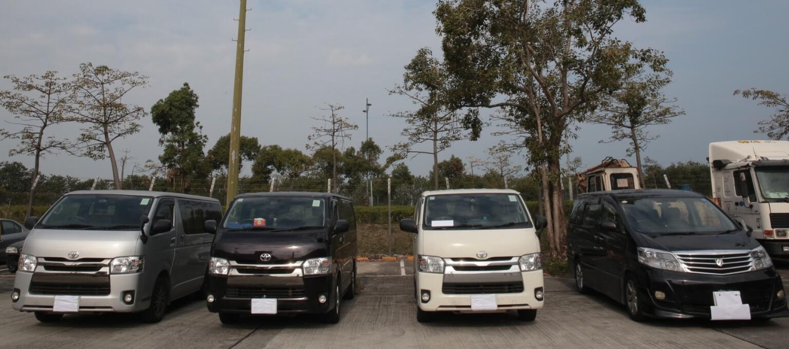 4輛違法載客的白牌車被警方扣留在小蠔灣汽車扣留中心,最右一輛涉跨境載客。