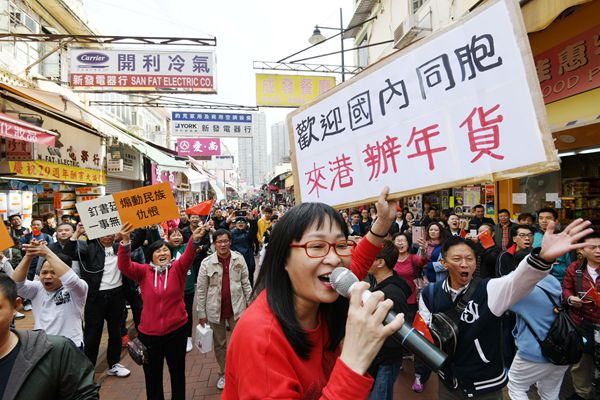 「愛港行動」一行約10人則高舉「歡迎國內同胞來港辦年貨」的紙牌,沿途向途人派發國旗,以支持內地旅客正常購物,警方在場戒備,分隔兩批人士,示威者以「大聲公」對罵,但並無進一步衝突。召集人陳淨心表示,限制內地人來港的任何措施都十分不公平,因為港人隨時都可到內地任何一個城市消費及辦年貨,並沒有出入口次數限制,且內地人來香港購物是促進本地經濟發展,如果改為「一年八行」,將為香港帶來嚴重影響。