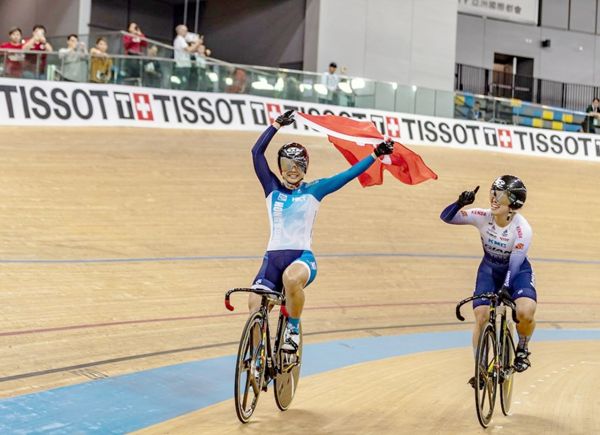 李慧詩世界盃香港站凱林賽摘金,再成「雙金后」。她賽後手揮區旗,與首獲季軍的隊友李海恩一同繞圈接受觀眾致意。