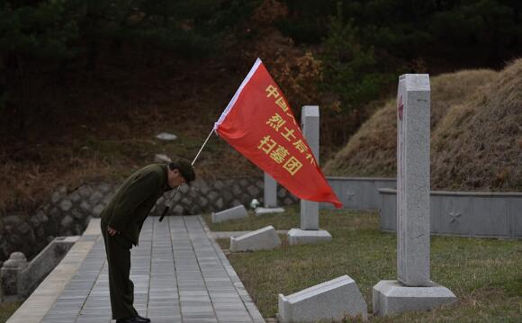 志愿军后代在朝鲜向无名烈士墓鞠躬。他父亲的墓地在军事禁区无法到达。(视觉中国)