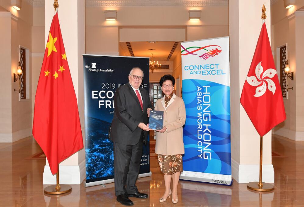 行政長官林鄭月娥(右)昨早在禮賓府與美國傳統基金會創辦人傅爾納博士會面,並從他手上接過日前公布的2019年《經濟自由度指數》報告。