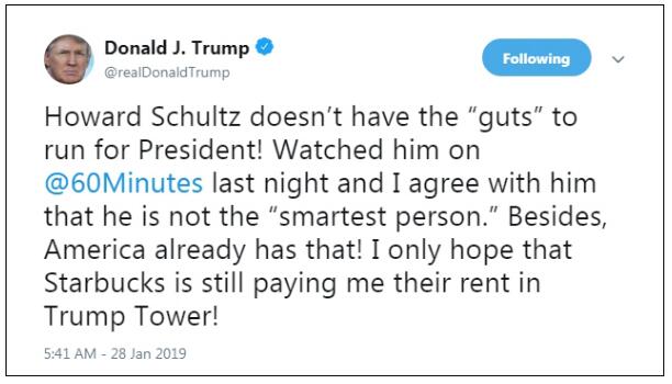 在当地时间1月28日凌晨5点的推文中,特朗普形容舒尔茨“没种”参选总统,还嘲笑舒尔茨在《60分钟》采访中形容自己不是“最聪明的人”,因为“美国已经有了最聪明的人”(暗指他自己)。