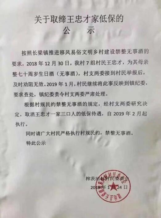 根据村规民约禁整“无事酒”的规定,村支两委研究决定,取消王忠才一家三口的低保待遇,自2月起执行。处理决定目前正在公示。