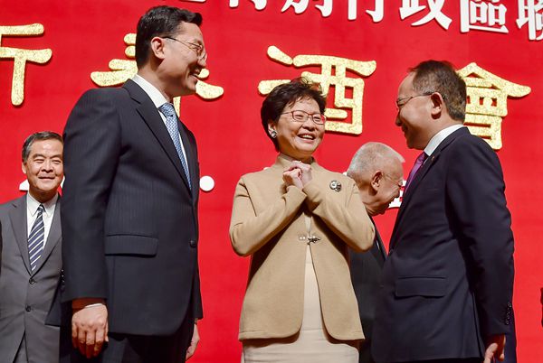 酒會上中聯辦主任王志民與特首林鄭月娥及外交部駐港特派員謝鋒相互道賀。 中新社