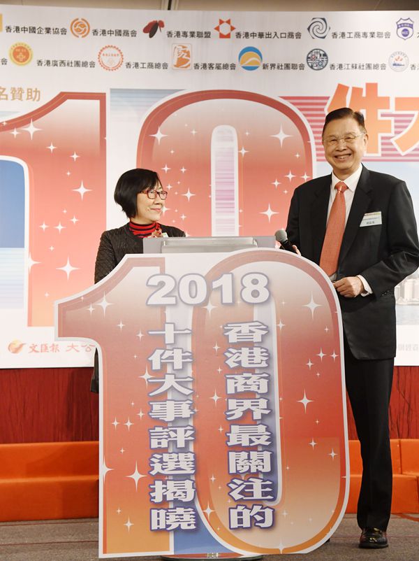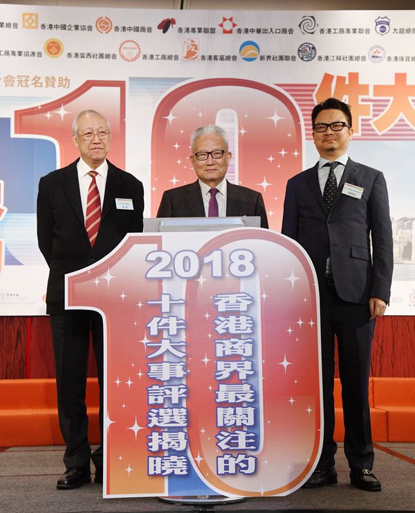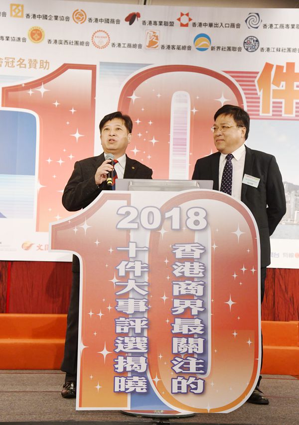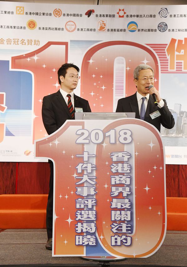 「2018香港商界最關注的10件大事」評選活動,由香港經貿商會會長李秀恒主持揭曉環節。他在台上笑言,一年一度的評選活動好似現時流行的通識教育,令商界朋友一齊溫故知新,共同洽談未來計劃。改革開放40周年成最關注